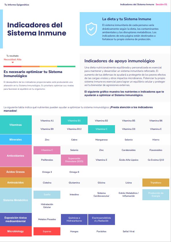 Si buscas mejorar tu salud global y fortalecer tu sistema inmunológico, este informe epigenético de salud es la herramienta que necesitas. A través del análisis de tu bioinformación celular, descubrirás cómo tu cuerpo procesa los nutrientes y qué factores influyen en tu bienestar físico y emocional.